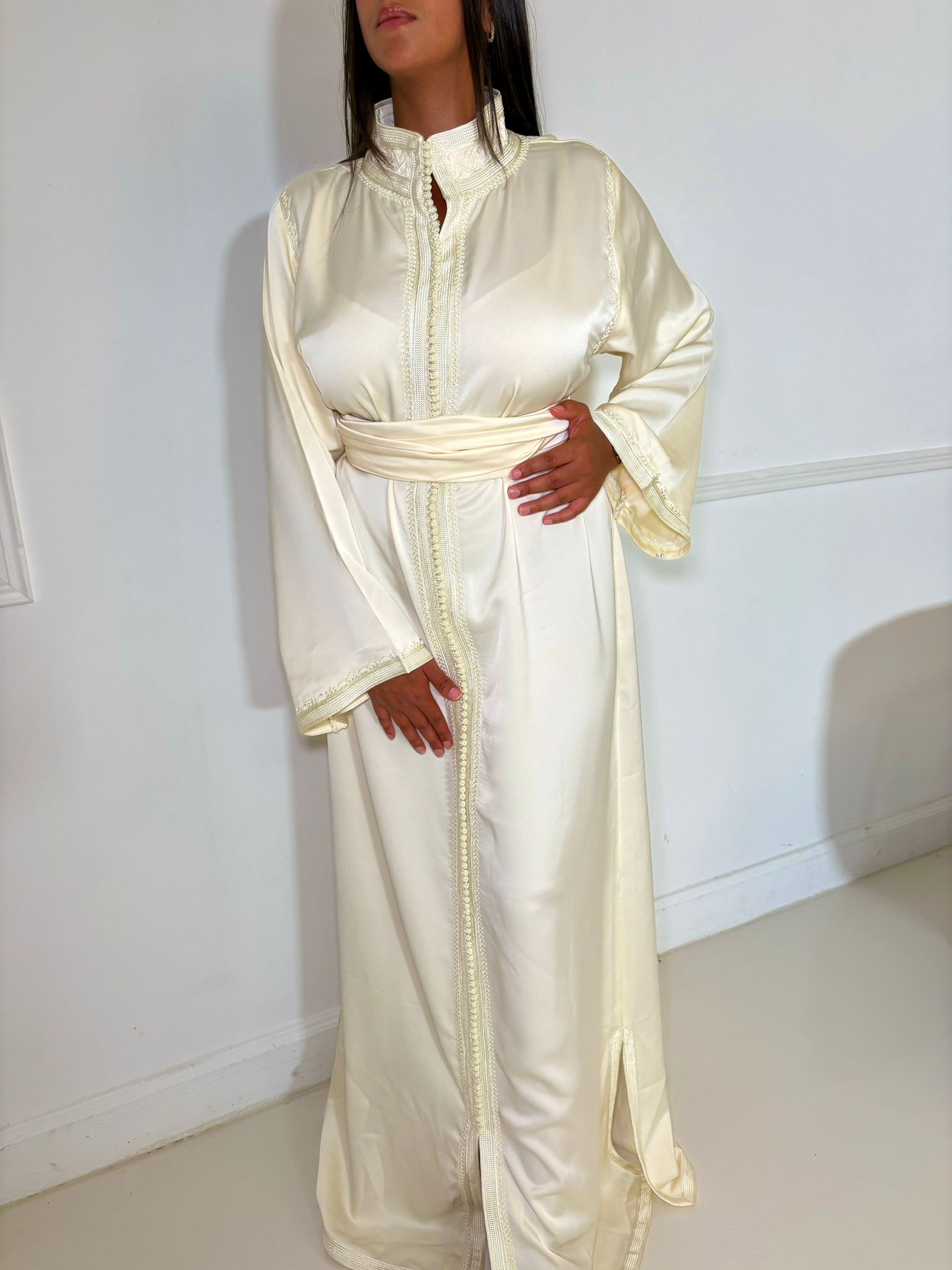 Élégance, intensité et raffinement s’invitent dans votre garde-robe avec ce somptueux caftan blanc écru.