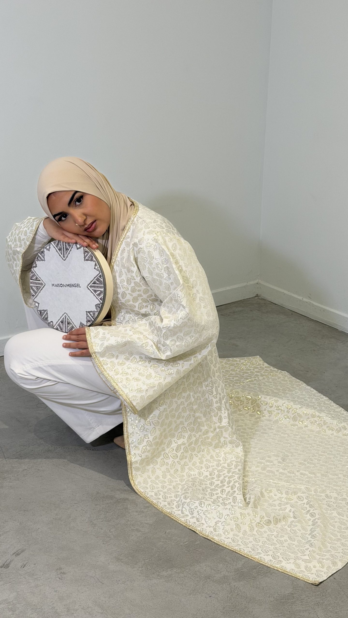 Confectionné dans un somptueux brocard ivoire rehaussé de motifs dorés, il offre un jeu de texture et de brillance qui capte la lumière à chaque mouvement. Sa coupe fluide et ample sublime la silhouette avec grâce, tandis que les finitions dorées le long des bordures ajoutent une touche de luxe discret.