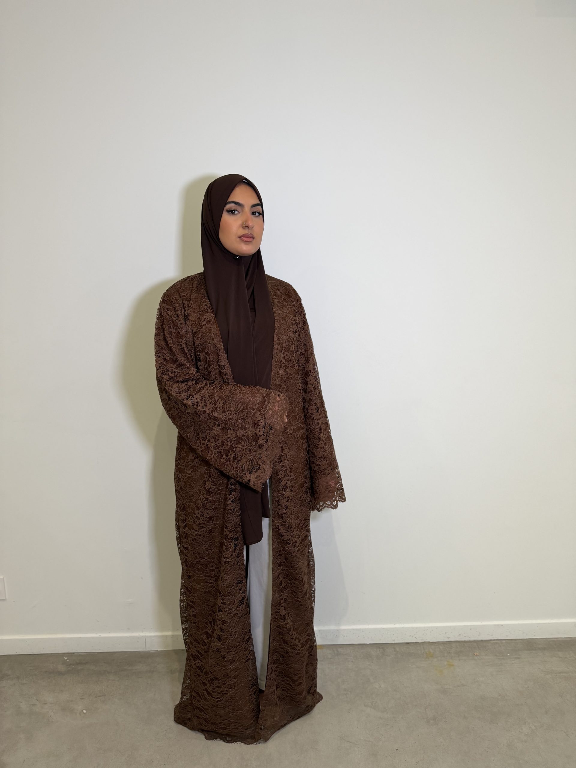 Découvrez la délicatesse et le charme intemporel du Kimono Lace Marron signé Maison Mensel.