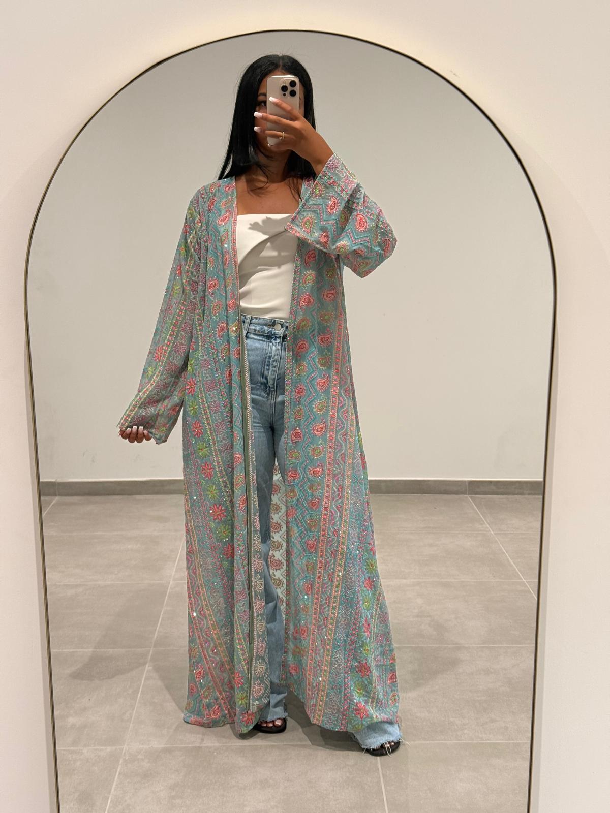 Ce kimono long est confectionné à partir d’un somptueux tissu sari indien, réputé pour ses motifs délicats et ses reflets subtils.